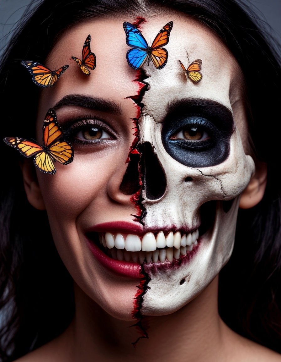 Beautiful woman with right half of her face as an open hyper detailed skull, extreme teeth knocked out, butterflies flying out of the eye sockets, the other half has dark makeup and black hair, very realistic photo of a skull taken from above, close-up, horror style, scary atmosphere, dark colors, light on the skin. Bright butterfly flying in front of him, realistic skull and chipped teeth, horror, trash photography. Professional scary shooting], absolute quality
