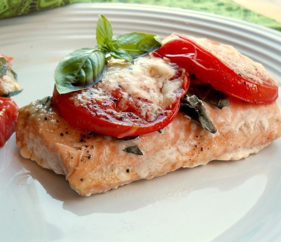 Лосось с помидорами и базиликом в духовке Лосось (филе) - 600 гр. Помидор - 200 гр. Сыр Пармезан - 28 гр. Чеснок - 20 гр. Базилик - 8 гр. Масло оливковое - 20 мл. Соль - по вкусу Перец черный молотый - по вкусу пошаговый рецепт на cookhelp.ru #быстроприготовить #простыерецепты #изрыбы #рецепты #cookhelp
