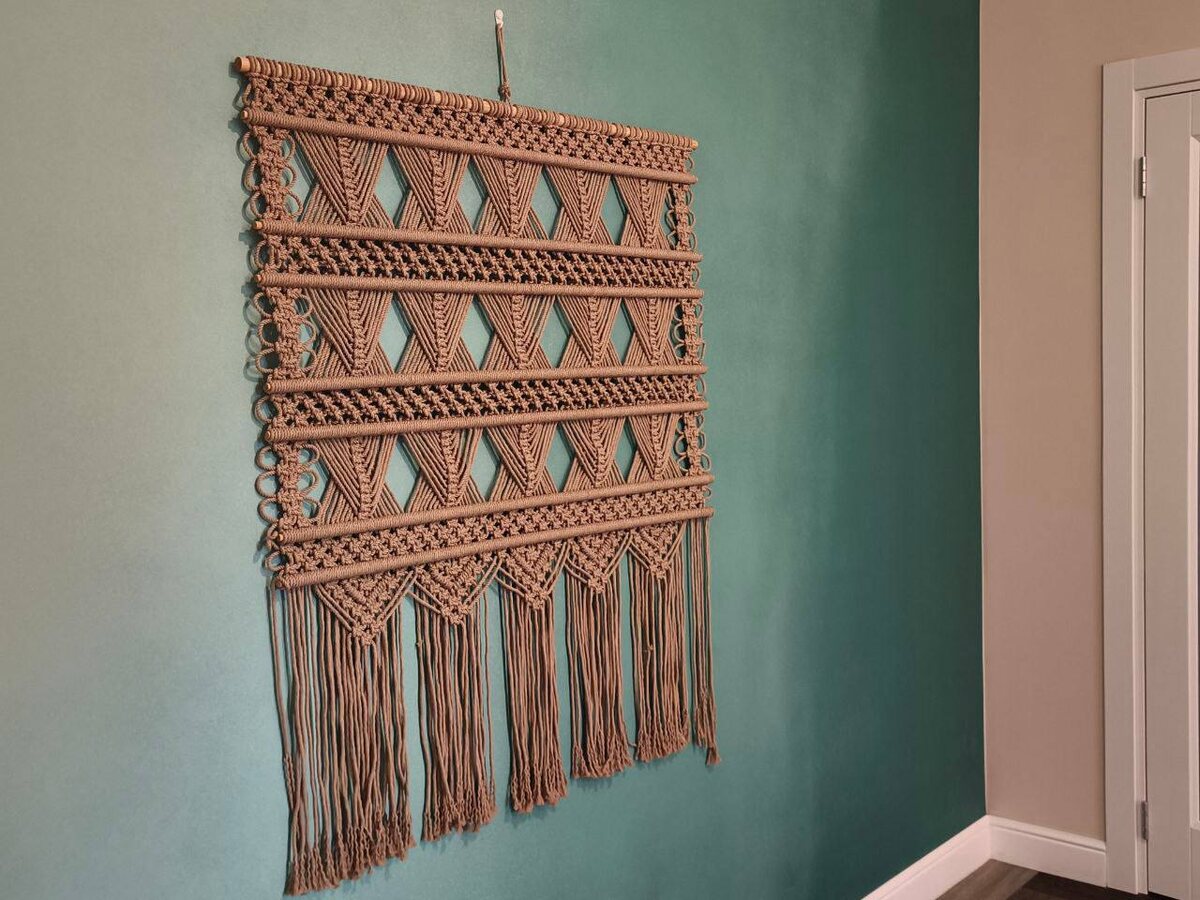 Привет из дома покупателей моего панно 🤎 Я заметила, что детали, над которыми я парюсь и выверяю до миллиметра, для клиентов не важны 😅 Прекрасная покупательница панно Елизавета отправила эти фото, и я запаниковала - вижу, что с палки слетела крайняя верёвка, и плюс панно после транспортировки съежилось, ему нужно немного отвисеться и выправиться. Но на мои эти переживания хозяйка панно весело ответила, что ничего страшного, она поправит крайнюю веревку, и что вообще все выглядит замечательно, как она и представляла, а то, что я говорю - это все мелочи Благодарю клиентов за покупку и обратную связь! Очень красивое сочетание цветов в интерьере! Белый, голубой и бежевый 😍 Панно классно вписалось 🛋️ #макрамевделе TEXSENSE макраме: идеи и творчество