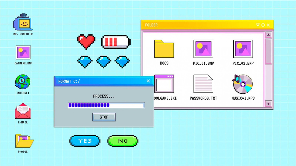 - Яркие цвета. На тот момент мониторы поддерживали ограниченное количество цветов — например, 256 или 16-битную палитру. Именно поэтому чаще использовались яркие оттенки: они выглядели на экранах контрастнее и «живее», чем приглушенные.