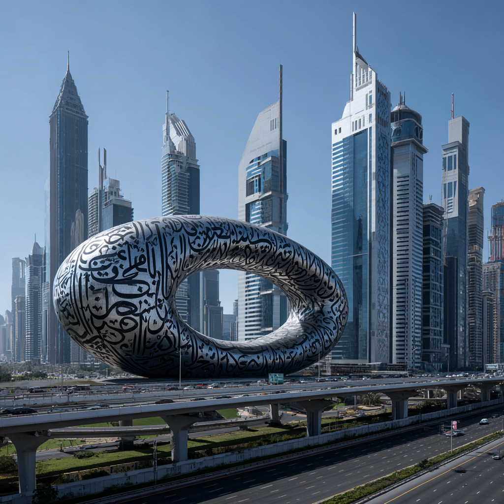 Этот музей стал новой визитной карточкой Дубая. Фантастическое здание в форме кольца с арабской каллиграфией — уже повод остановиться и сделать фото.