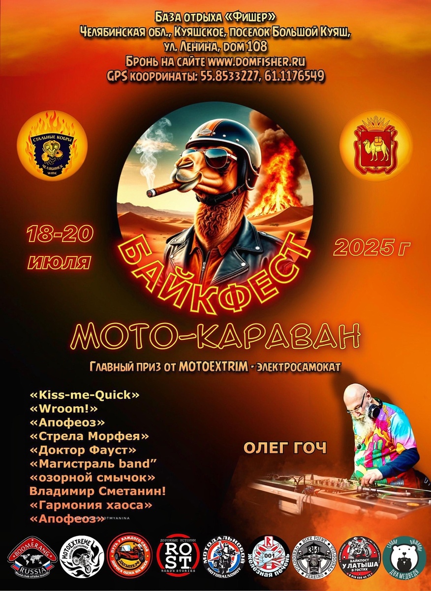 уб в сутки; ОПЛАТА НАЛИЧНЫМИ ИЛИ ПЕРЕВОДОМ НА КАРТУ! 🇷🇺 Президент- бесплатно. 👦 дети до 7 лет - бесплатно 🐶Можно с животными . Выгул за территорией поляны. Обязательно обработайте мохнатых от клещей. Какашки 💩 за хвостиками убирать!!! На территорию запрещается провозить, проносить и протаскивать: 🔪🪓оружие , 💊💉🍄наркотики, 💩палёное бухло и плохое настроение! В программе: ЗА ДВА ДНЯ НА СЦЕНЕ НАШЕГО ЮБИЛЕЯ МНОГО КЛАССНОЙ МУЗЫКИ: «Kiss-me-Quiсk» «Wroom!» «Апофеоз» «Стрела Морфея» «Доктор Фауст» « Магистраль band” «озорной смычок» Владимир Сметанин! «Гармония хаоса» «Апофеоз» 🎁 МОТО КОНКУРСЫ и ПОДАРКИ . Главный приз от нашего спонсора Мотоэкстим-электросамокат! 🧵 от нашего спонсора « Два медведя» мастер класс вышивки. Каждый может заказать вышивку и наблюдать за ее изготовлением. 🔥 ФАЙЕР-ШОУ 💰МОТО БАЗАР для справок: вице-Презедент WMC « Стальные Кобры» +79260698936 Татьяна. Для всех гостей комплексное питание. Заказ оформляется при бронировании проживания. Прайс отдельно на