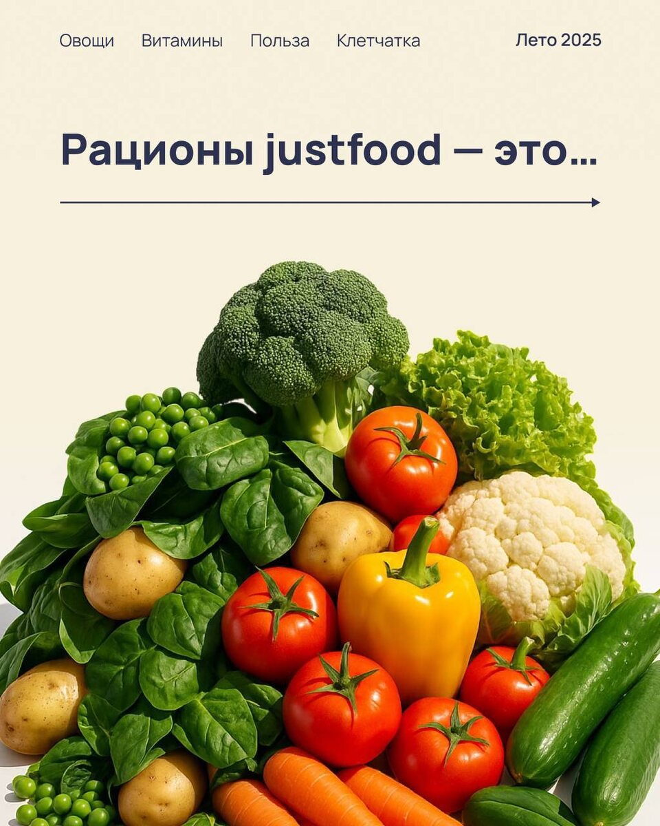 ☀️ Какое лето на вкус? Одна из главных ассоциаций с летом для нас — это овощи Свежие, сочные, запеченные в духовке, приготовленные на пару, отварные: встретить их в рационах justfood можно в разных видах Овощи важны, потому что: ▪️являются настоящей кладезью витаминов ▪️нормализуют пищеварение благодаря клетчатке ▪️укрепляют иммунитет ▪️поддерживают молодость организма с помощью антиоксидантов В карточках делимся, сколько килограмм овощей используем для приготовления блюд в месяц Скорее листайте и делитесь в комментариях, какие овощи чаще всего появляются на вашем столе
