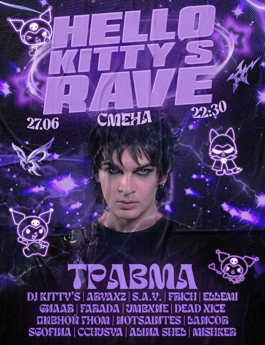 KITTY’S RAVE В СМЕНЕ 27 ИЮНЯ 😈😈😈 Хочешь погрузиться в мир красоты и неонового безумия?Добро пожаловать на самый стильный 🥳РЕЙВ🥳 года! Погрузись в атмосферу будто ты идёшь по главной улице Японии🥹 Ожидаем самых стильных гостей 🖤в футуристических нарядах😊! Для наших kitty’s😊 : Просторная веранда для танцев⭐ СЦЕНЫ с уникальным световым шоу🥰 Тематическое оформление площадки🥺 Фотозона для идеальных кадров🙂 И конечно же хедлайнер мероприятия ТРАВМА 🍸спешиал коктейли «KUROMI NIGHT😴» для самых смелых Погрузись в мир красоты и неонового безумия 🎟 Билеты в продаже, цена будет расти 📆 27 июня, 22:30 — 06:00 📍Смена, Москва, Товарищеский пер. 4с5