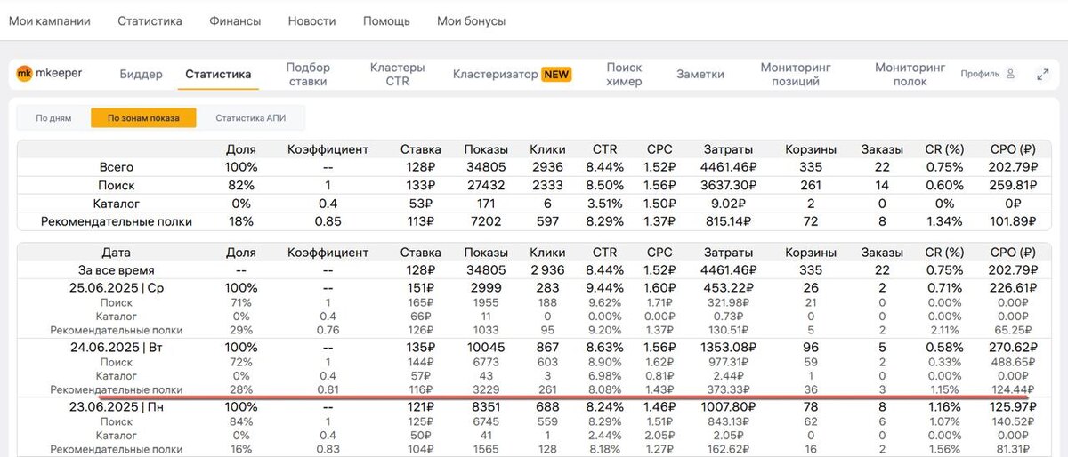 Теперь в статистике по зонам показов количество корзин и заказов выводится по каждой зоне показов!