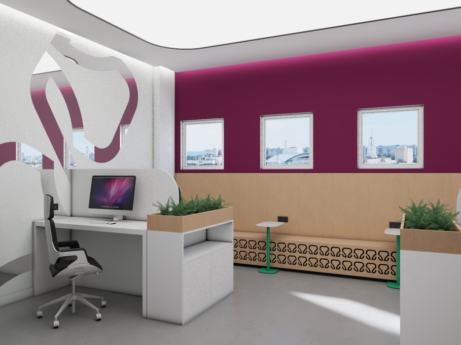 «Вопрос дизайна интерьера учебных заведений всегда актуален. Он напрямую влияет на психологическое состояние студентов, их мотивацию и даже уровень усвояемости материала. Исследования показывают, что правильно организованное пространство может значительно повысить продуктивность и креативность, поэтому важно создать пространство, способствующее обучению и развитию, а также учитывающее экологические и эмоциональные аспекты», — рассказывает о своем проекте студентка вуза, автор проекта Александра Марищук.
