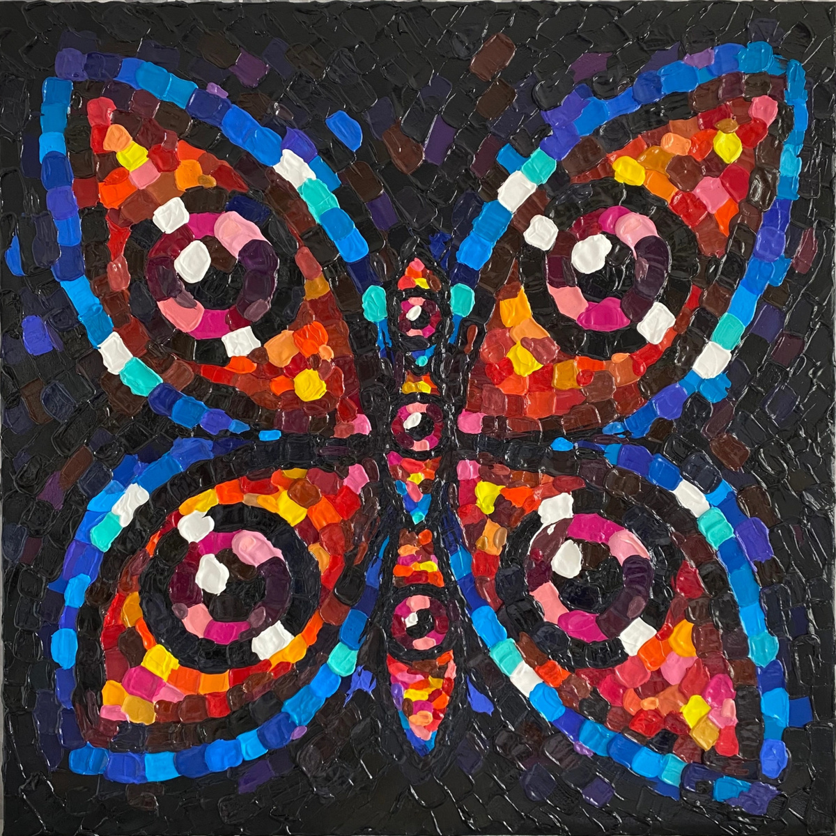 Приветствую вас. Я – Юрий Баринов, и кисть или мастихин в моей руке – это проводник в мою голову. Сегодня хочу рассказать вам не просто о картине, а о работе, которая стала для меня особым откровением. Знакомьтесь: «Эффект бабочки» – мой взгляд в самое сердце вселенной. Создавая эту работу, я думал о хрупкости и одновременно о невероятной силе каждого мгновения. Помните теорию? Взмах крыльев бабочки в одной точке мира может вызвать ураган в другой. Но здесь, на этом холсте размером 80х80 см, рожденном в 2024 году, я пошел глубже. Я задался вопросом: а что, если взгляды это и есть те самые взмахи крыла? Взгляд художника, взгляд зрителя, взгляд самой Вселенной? Как и другие работы серии «ОКО», эта картина – о восприятии. О том, как множество отдельных взглядов, словно мозаика, складываются в единое, гармоничное целое. Присмотритесь. Глубокие синие, мерцающие фиалковые, розовые и оранжевые – они не просто цвета. Это – взгляды. Очи, растворенные в абстрактном пространстве, сливающиеся