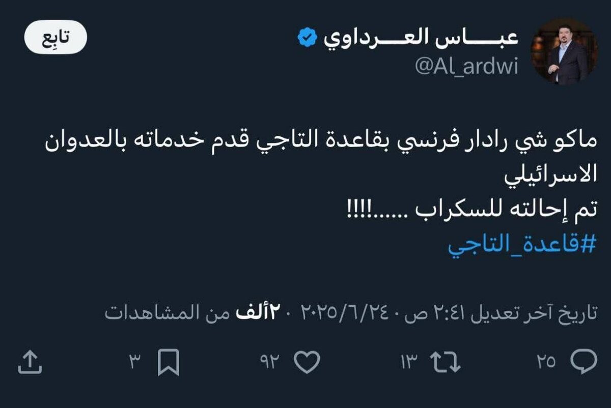 После атаки беспилотников на РЛС иракской армии утром 24 июня министерство обороны Ирака объявило об аресте сетевого активиста Аббаса аль-Ардави после того, как он опубликовал твит в своем аккаунте на Х, в котором оправдал атаку на РЛС, заявив, что РЛС предоставленный Францией помогал самолетам Армии обороны Израиля на пути в Иран.