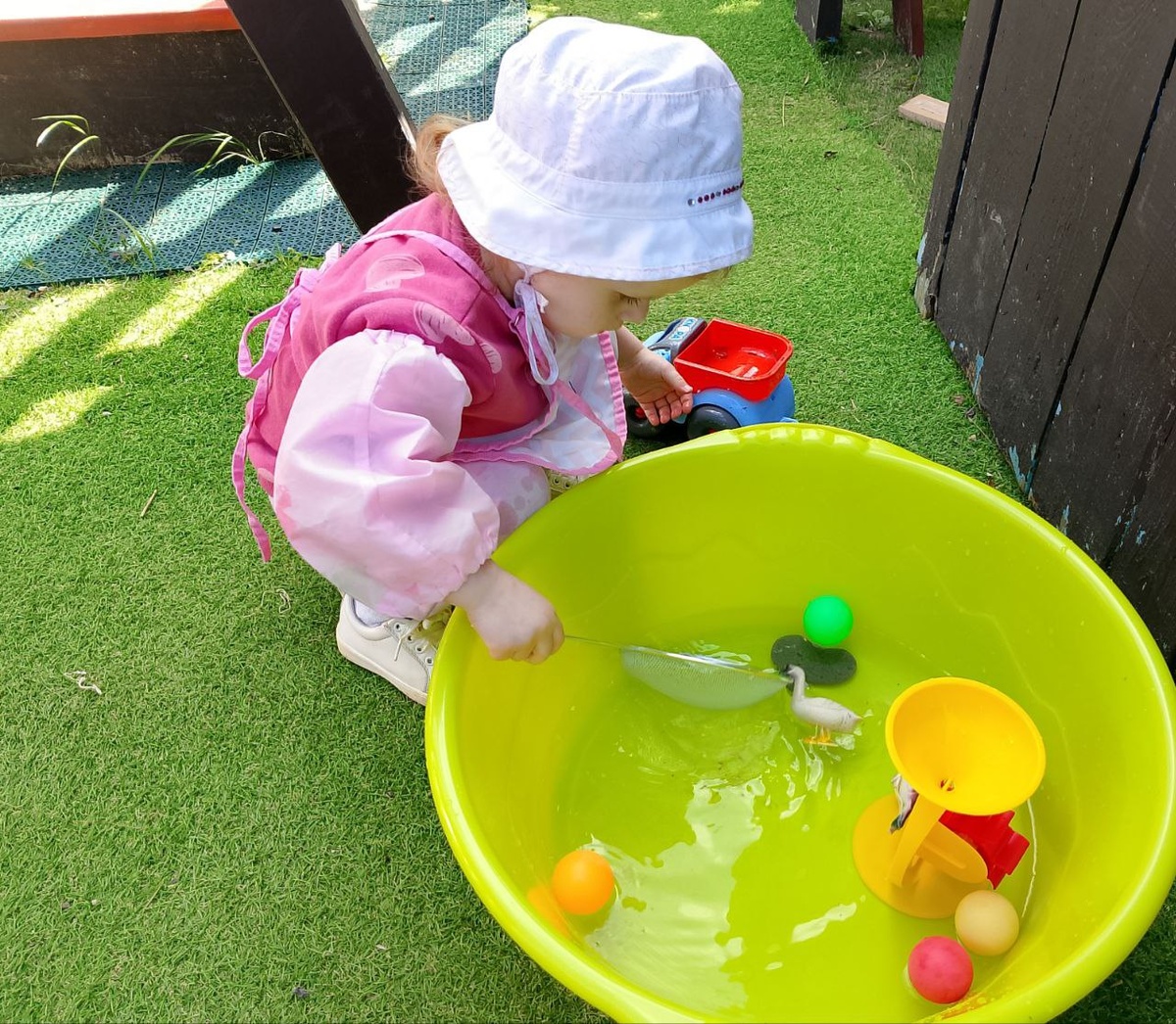 Оно рекомендовано детям старше 3 лет, но я рискнула и попробовала предложить двухлетней дочери выловить фигурки зверят ситечком. В предыдущей статье описана эта игра. У ребёнка всё получилось. И занималась дочь с радостью. Сегодня я снова предложила дочери вылавливать предметы ситом, но игра отличается от предыдущей. Для большей свободы движений мы решили переместиться на свой участок. Там можно брызгать и лить воду мимо тазика.