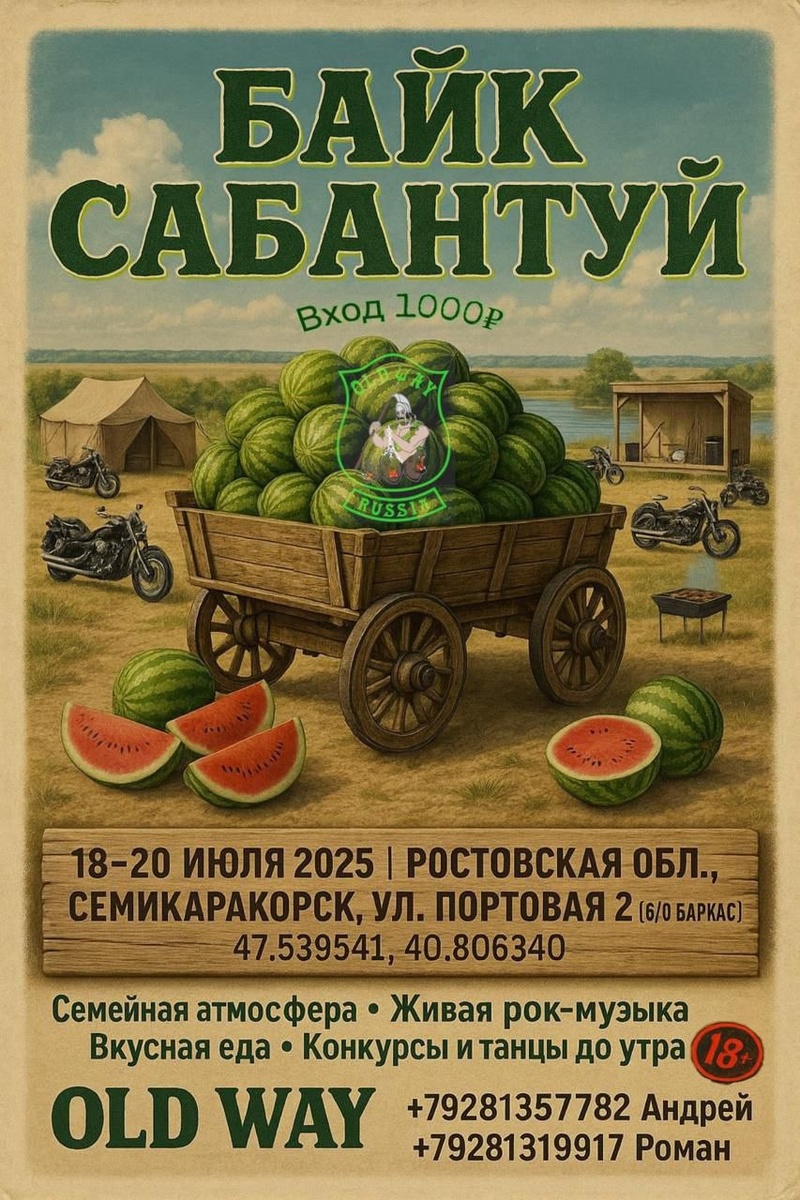✏️ Дальняк.рф™: Мото-клуб OLD WAY проводит 9-й, уже ставший традиционным, Байк Сабантуй!!! Мероприятие будет проходить с 18 по 20 июля 2025 года, на базе отдыха «Баркас», на берегу реки Дон, недалеко от г. Семикаракорск Ростовской области. Координаты 47.539541 40.806340 В программе: выступление рок-групп, много вкусной еды и закусок, весёлые конкурсы. Стоимость входа, въезда - 1000 р. Девушка на мото - бесплатно. Проживание - палаточный городок. По организационным вопросам +79281357782 Замполит. Организатор оставляет за собой право отказать в доступе на мероприятие без объяснения причин. Автор: https://vk.com/id386550157