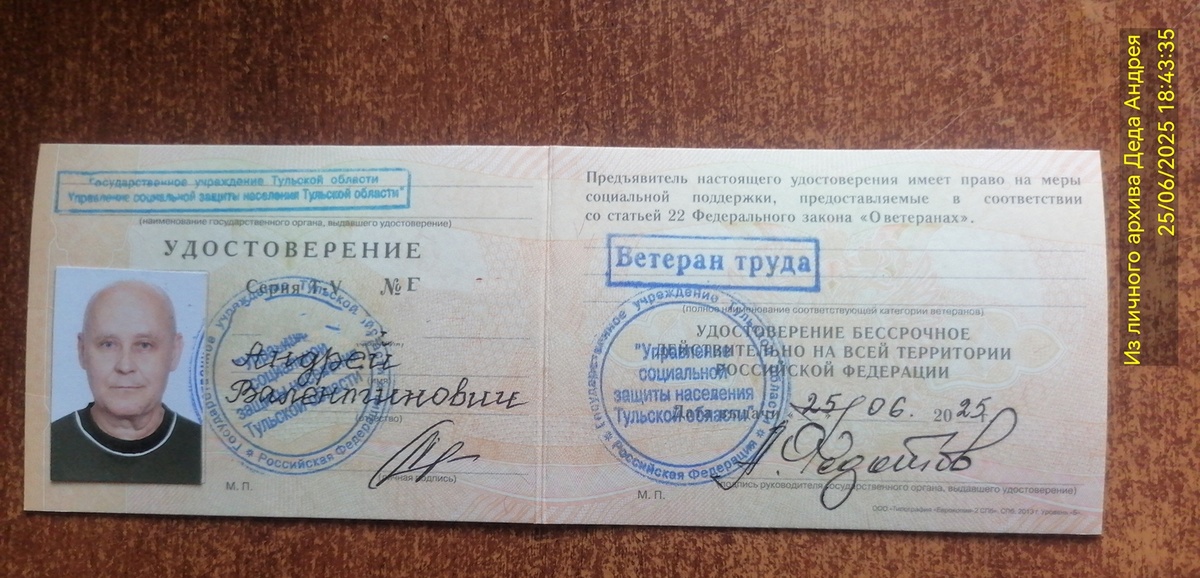 (получение звания ветерана труда - окончание) Вот и наступило 25 июня, срок исполнения заявления на получение звания. Учитывая, что пару дней назад с соцзащиты позвонили и сказали, что мне будет отказано, я сегодня после работы собирался туда заехать, что бы забрать официальный отказ. В МФЦ, при оформлении заявления, мне сказали, что 25-го я должен прийти в районную соцзащиту по месту жительства, но в 8.26 раздался звонок. - Андрей Валентинович, это... из соцзащиты. Все таки, после продолжительных боёв, принято решение о выдаче вам удостоверения ветерана труда. Приходите, с собой возьмите фото 3*4. - Спасибо большое. - Приходите по адресу..., кабинет 15. Когда вы будете? (небольшое недоумение, ведь по этому адресу находится отдел другого района). - Сегодня, около 17, я работаю до 16.30. - Хорошо, досвидания. Около 17 стучусь в пятнадцатый кабинет (а это оказался городской отдел соцзащиты). Захожу. Берут одну фотографию и просят подождать. На всё уходит минут 10-15. Приглашают з