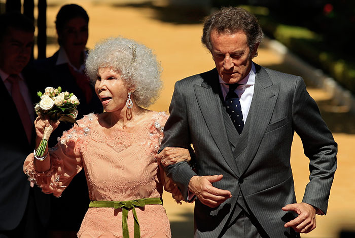 Невесте было 85 , жениху 61 , она была в розовом платье и сплясала фламенко , ему было всё равно , как она выглядит. С ним она помолодела лет на 20 и была искренне счастлива - говорили близкие. Это моя жизнь и я проживу её , как можно ярче - говорила она сама. Каэтана Альба была богатейшей женщиной Европы , по количеству титулов она опередила британскую королеву и попала за это в книгу рекордов Гиннеса. Считается , что у неё самая голубая кровь в мире. Она свободно владела пятью языками. Её темперамент был - огонь. Родилась Каэтана в 1926 году в Мадриде .Отцу уже было 42 и он ждал сына , а мать умерла , когда ей было 8 лет.Во время второй мировой войны она жила в Лондоне , где подружилась с Лиззи , которая со временем станет королевой Англии. Эту дружбу женщины пронесли через всю жизнь. Красавицей Альба никогда не была , но обладала харизмой , обаянием и огромным состоянием. Выходила замуж 3 раза , но конечно самым эпатажным был последний брак. Первым мужем стал жених знатного происх