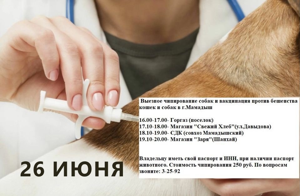 ❗ 26 июня 2025 года в Мамадыше состоится выезд мобильных пунктов по обязательной регистрации, чипированию и вакцинации домашних животных против бешенства. В течение дня специалисты ГБУ «Мамадышское РГВО» будут работать в разных точках города, куда владельцы смогут подойти со своими питомцами — как собаками, так и кошками.