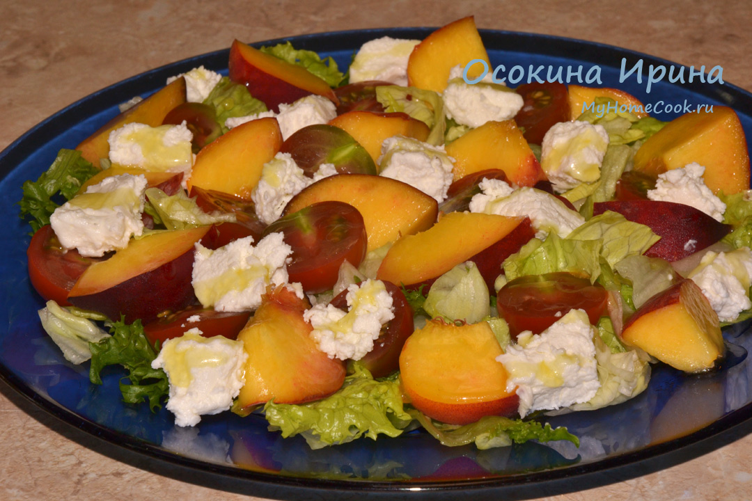 Лето для нашей семьи, кроме прочего, пора салатов и закусок с фруктами и ягодами. Сегодня такой вариант: в миску сложила смесь салатных листьев, присолила, сбрызнула оливковым маслом, промешала, разложила по тарелкам, поверх разложила помидорки черри половинками, резаные персики и кусочки козьего сыра. В пиалке смешала 2 ст.л. оливкового масла, 1 ст.л. жидкого мёда и 1 ч.л. лимонного сока, промешала до однородности и полила салат в тарелках перед подачей. Ооочень вкусно нам было)
