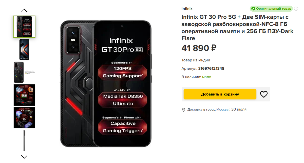 На момент написания обзора, в зависимости от площадки интернет-торговли, Infinix GT 30 Pro 5G можно было приобрести в пределах 42000 рублей.