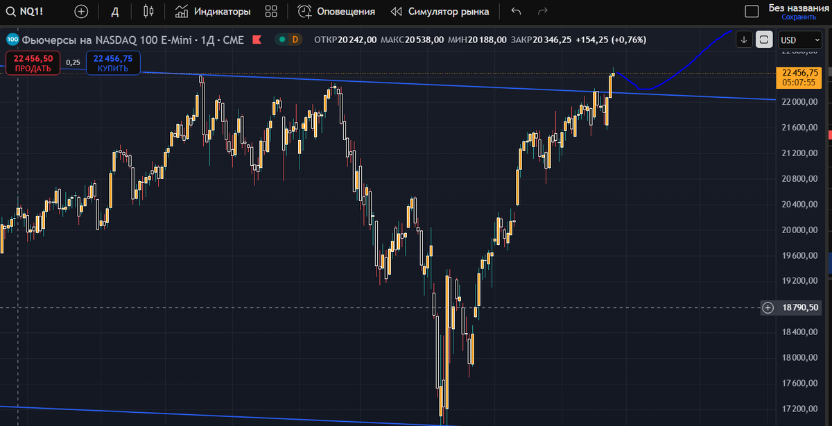 Дневной график фьючерса на NASDAQ-100 (NQ1! CME). Исторический максимум. О чем это может говорить и что нас может ждать? С точки зрения технического анализа: Цена пробила верхнюю границу (тонкая синяя линия) — возможно, это ложный пробой или начало ускорения вверх. Предыдущие касания этой трендовой линии были сопротивлением — сейчас идёт тест сверху, и это уже , как-будто, линия поддержки. Краткосрочный импульс вверх сквозь сопротивление (+0,76% на дневке, уверенный рост), цена на 22 456, что выше февральского пика — это локальный breakout. Нарисовал синюю кривую (вангование) Возможна плавная коррекции обратно к пробитому уровню и затем дальнейший роста, вверх в ускоряющемся канале, либо сценарий вниз, если уровень не удержится. Важно учитывать общий фон. • доходности облигаций, • ФРС (риторика), • отчётность компаний. Новый максимум после глубокой просадки — это важный момент с точки зрения рыночной психологии и исторических паттернов. Исторически это означает: 1. Подтверждение смен