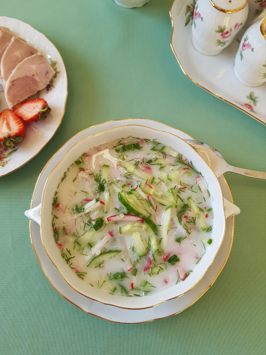 Добрый день, дорогие друзья! Сегодня я представляю вашему вниманию узбекский холодный суп, который станет отличным обедом в жаркий день. Для приготовления нам понадобятся: свежие огурцы 300 грамм, редис 200 грамм, зеленый лук 50 грамм, укроп 30 грамм, айран 1 литр, соль 1/2 чайной ложки. Приготовление: зеленый лук нарезать. Нарезать веточки укропа, посолить и помять зелень с солью, чтобы она дала сок. Нарезать соломкой редис. Нарезать соломкой огурцы. Перемешать, поставить охлаждаться в холодильник на несколько часов. Разложить по бульонницам, залить айраном. Освежающий холодный суп готов. А если дополнить его запеченной индейкой, бужениной или запеченной свининой, то это блюдо способно надолго утолить не только жажду, но и голод. Приятного аппетита! Для тех кто привык к более сытному холодному супу: