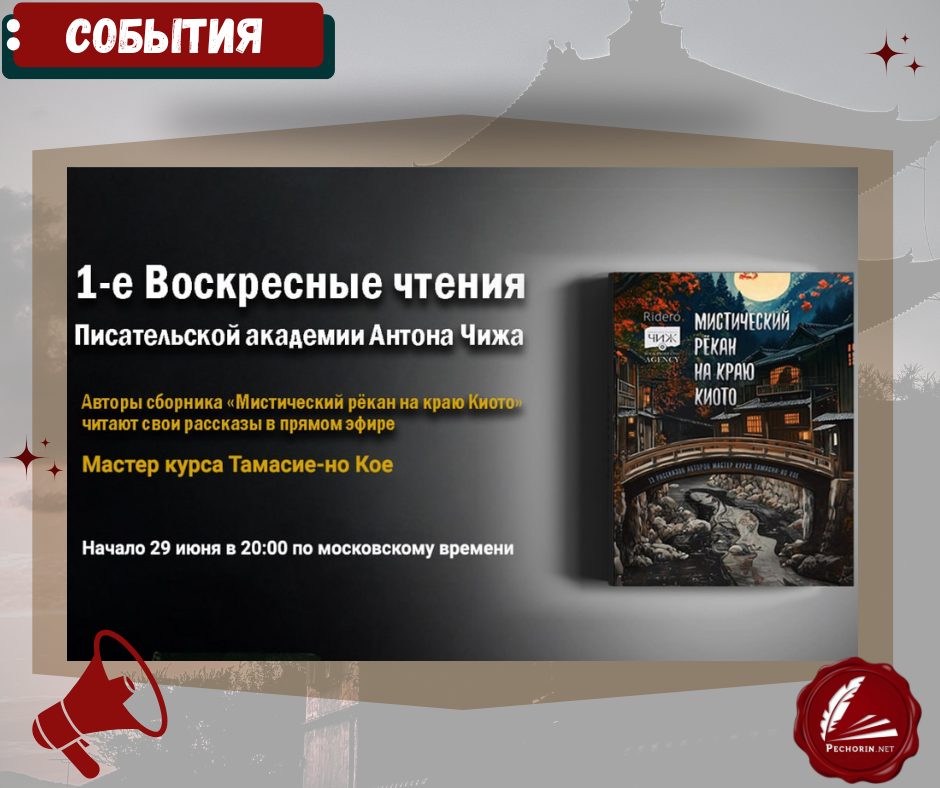 Авторы сборника «Мистический рёкан на краю Киото», созданного на курсе Тамасии-но Кое, будут в прямом эфире читать свои рассказы. Программа чтений: • Алексей Небыков, главный редактор портала «Печорин.нет», прочитает свое новое произведение — рассказ «Неодолимая тишина света»; • Елена Валужене прочитает «Ночь призраков»; • Дмитрий Тришин (Кадзицу Яманэко) — «Наследие оммёдзи»; • Елена Гулкова — «Не смотри на небо через тростинку»; • Гульнара Василевская — «Сиекоро юкар». О сборнике: В книге вы найдёте мистическую атмосферу Японии, где люди встречаются с ёкаями, призраками и оборотнями. Вся японская нечисть собралась под одной обложкой. Леденящие кровь ужасы и тёплые, уютные истории со светлым концом. ⌛️29 июня 20:00. 💳Вход на онлайн-мероприятие свободный. ❗️Необходима регистрация. Подключайтесь к чтениям и читайте сам сборник. 🔻Все подробности и ссылка на книгу в электронном сервисе «Ридеро» тут.