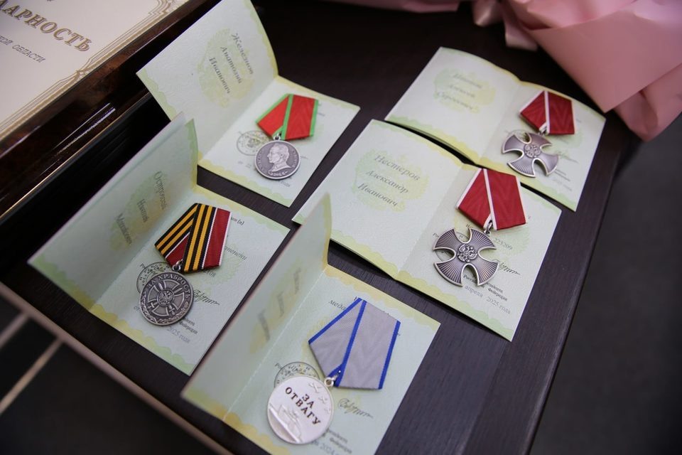 На заседании городской думы Калуги вручили медали «За отвагу» сержанту Александру Киселеву. Еще четверо калужан-участников спецоперации были награждены указом президента России посмертно. Матрос Александр Нестеров и сержант Алексей Иванов - орденом Мужества, рядовой Николай Островский — медалью «За храбрость» II степени, а младший сержант Анатолий Железнов — медалью Суворова. Награды на заседании думы вручили родным погибших солдат.