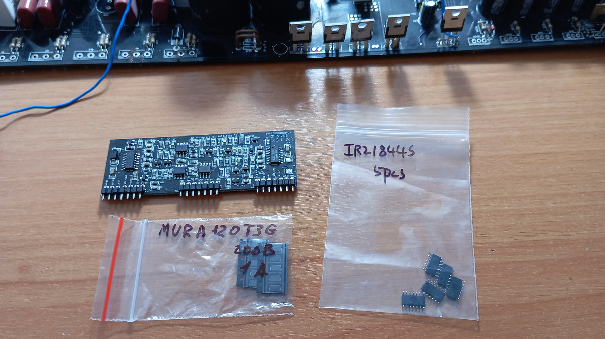 Салют всем! Продолжаю "починять примус" (с) ремонтировать усилитель. Предыдущее... Заказал U3,U4 (IR21844S) и диоды D3,D4 (U4D, MURA120T3G). Долго шла посылка с IR21844S. Наконец получил. Надо сказать, что IR21844S прислали б/у, заметно, что они паяные. И маркировка еле заметна. Буду пробовать. Модуль драйвера запаян в основную плату усилителя таким образом, что невозможно что-то делать. Ни измерить, ни перепаять. Потому я выпаял модуль. И тут возникает проблемка. Если запаять детали и установить модуль на место, то если что вдруг не будет работать, то снова выпаивать? Это неудобно. Решил установить модуль так, чтобы можно было работать с ним запаянным на месте. Для этого удлинил выводы. Иначе никак. Сначала народным методом удалил выводы модуля. Потом запаял длинные выводы. Заменил IR21844S обе, запаял диод D3. Промыл от флюса и установил на место. Теперь выглядит так. На плате модуля драйвера детали только с одной стороны, так что если что, можно работать, не выпаивая модуль