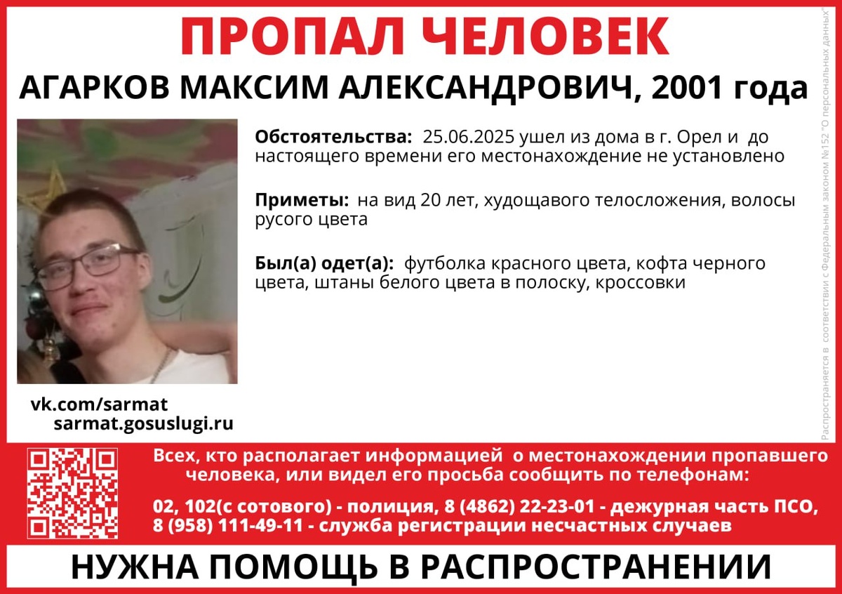 Разыскивается Агарков Максим Александрович 2001 года рождения, который 25.06.2025 ушел из дома в г. Орел и до настоящего времени его местонахождение не установлено