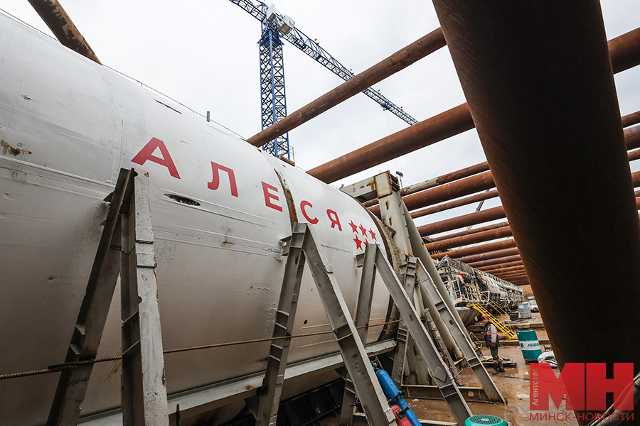 Тоннелепроходческий механизированный комплекс «Алеся» для продления Зеленолужской линии метро от площади Бангалор до станции «Юбилейная площадь» запустили 25 июня. Он будет работать в круглосуточном режиме с перерывами на техобслуживание. Подробности — в материале корреспондента агентства «Минск-Новости». «Алеся» в собранном виде уже несколько дней располагается на своем рабочем месте на ближайшие несколько месяцев — в котловане глубиной порядка 15 метров неподалеку от пл. Бангалор. Ее корпус украшают шесть звезд, символизирующих количество тоннелей, которые она проложила. Сам механизированный комплекс имеет внушительные размеры (длина порядка 100 м, а весит конструкция около 550 т) и способен прокладывать тоннель диаметром 6 м. Он состоит из щита и восьми технологических тележек, обеспечивающих его работу. Для обслуживания такого комплекса ежедневно будут привлекать по 9–15 человек в смену, при увеличении дистанции потребуется дополнительный персонал. В месяц «Алеся» способна преодоле