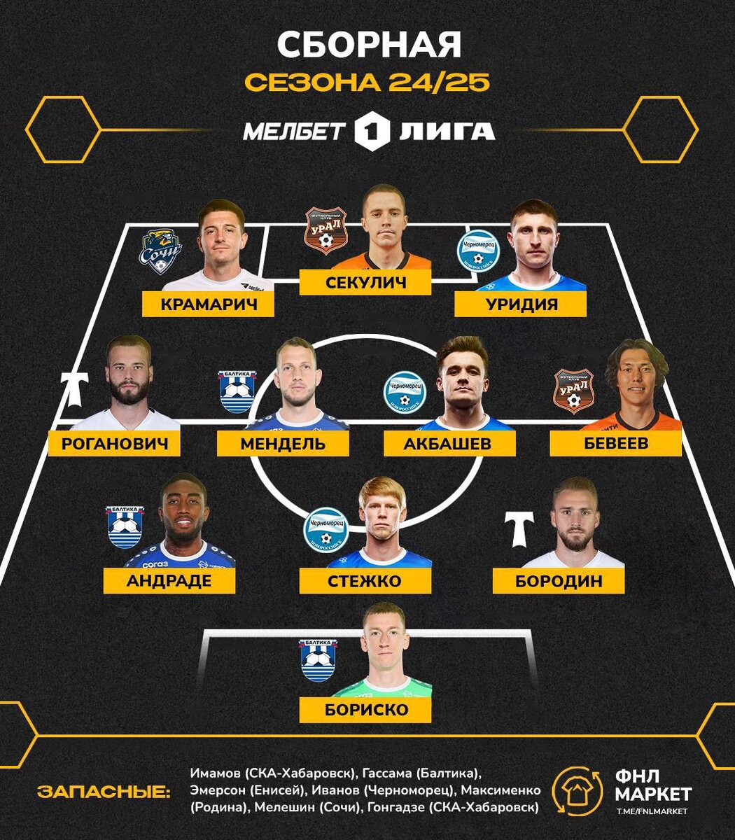 БАЛТИЙЦЫ СРЕДИ ЛУЧШИХ ⚽️ Максим Бориско, Кевин Андраде и Андрей Мендель, а также Натан Гассама в составе сборной сезона 24/25 МЕЛБЕТ-Первой Лиги по версии ФНЛ Маркет. Накидаем 🔥, Балтийцам?