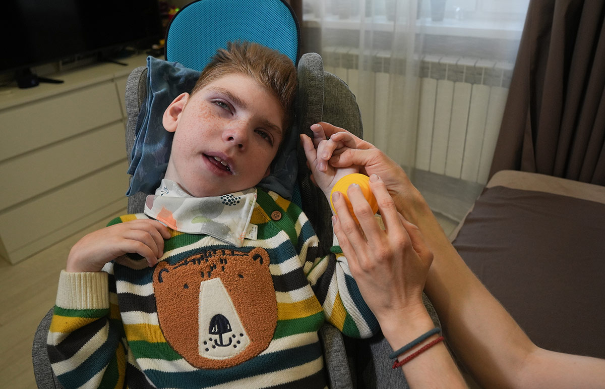 Родители называют 10-летнего Петю фарфоровой куколкой. Другие дети в 10 лет ходят в школу, играют в футбол, катаются на велосипедах. В Петиной жизни ничего этого нет. Он не сидит, не ходит, даже голову сам не может держать. Петя не говорит, и мы не знаем, понимает ли он речь. Но мальчик точно чувствует прикосновения своих мамы и папы и слышит их голоса. А родители любят свою фарфоровую куколку и заботятся о ней. После рождения Пети им очень страшно было решиться на второго ребенка. Но Гриша, младший, растет здоровым, радостным и заботливым. – Словно нам в награду очень хороший мальчик получился, – улыбается Анастасия, мама Пети и Гриши. Сразу после срочного кесарева сечения Петя попал в реанимацию, его подключили к ИВЛ. То, что у ребенка будут проблемы со здоровьем, было очевидно. Но никто не знал, насколько они будут серьезными. ДЦП Пете поставили еще в пять месяцев. По шкале моторных функций у него самый тяжелый V уровень этой болезни. Шансов на изменения нет. Врачи сразу честно сказ