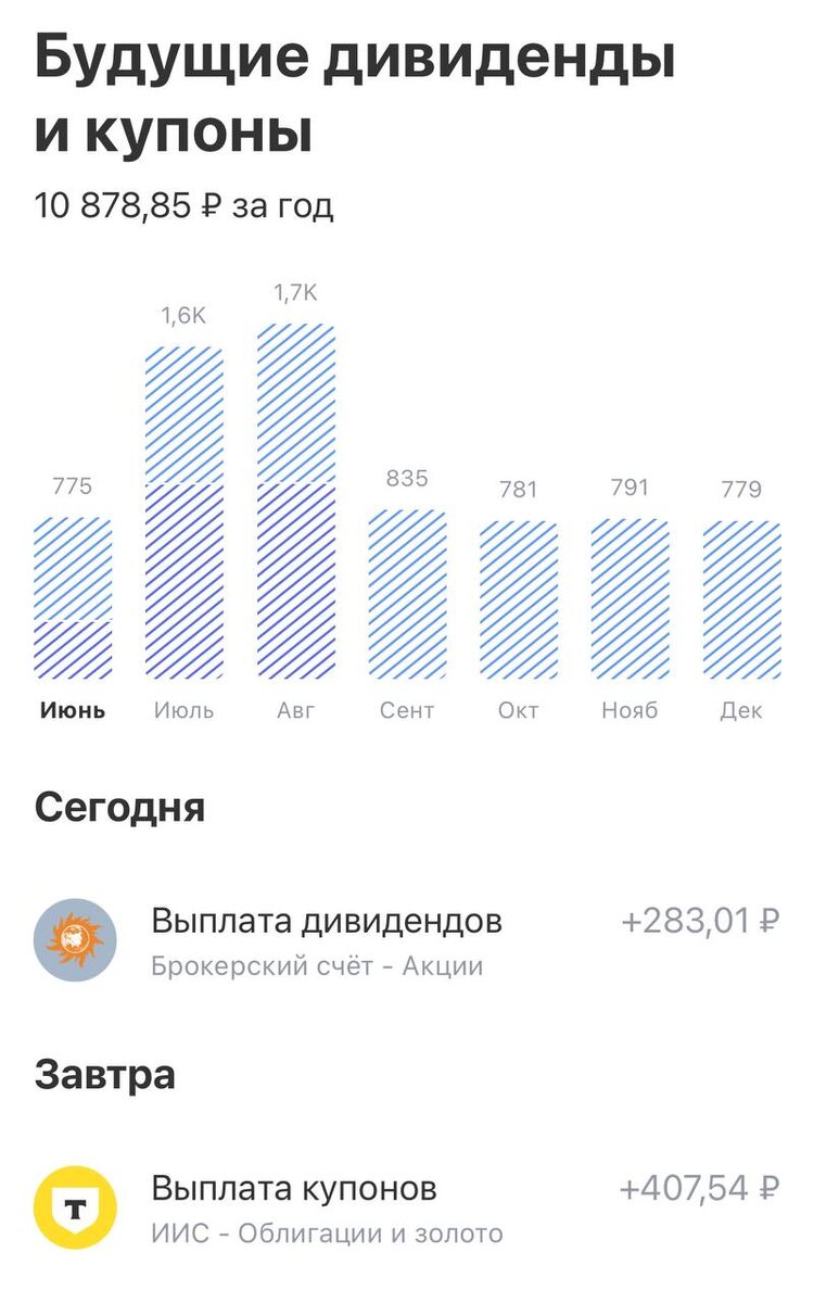 В новом приложении от $T появился очень крутой инструмент - календарь выплат Теперь можно глазами в одном месте без каких либо усилий увидеть в разбивке по месяцам когда и сколько ты получишь) И это прекрасно! График помогает понять, что скоро выйду на #купоны в месяц >1000р На сегодня было отмечено, что выплата дивидендов по $IRAO, видимо это выплата от самой компании и теперь надо пару дней подождать начисления Также сегодня день аванса, поэтому пополнил #иис и брокерский по 1500р #новичок_в_пульсе #прояви_себя_в_пульсе