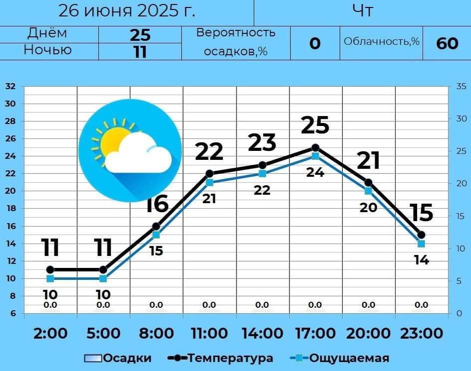 🌤 26 июня в Кургане переменная облачность, без осадков. Днем температура достигнет +25°C, ночью опустится до +11°C — это на 2 градуса ниже нормы.