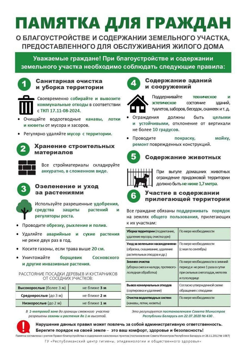 👉Внесены изменения в правила благоустройства и содержания населенных пунктов (постановление Совета Министров от 16 мая 2025 года №267). Конкретизированы требования к обеспечению надлежащего содержания земель общего пользования, а также земельного участка, предоставленного для обслуживания жилых домов, территорий, закрепленных за гражданами и субъектами хозяйствования. Для территорий индивидуальной застройки устанавливается обязанность по поддержанию в технически исправном состоянии зданий, сооружений, хозяйственных построек и ограждений, скашивания газонов при высоте травяного покрова более 20 см, уборки территорий от строительного и случайного мусора, удалению сухой растительности. Также регламентируется границы посадки насаждений применительно к смежным земельным участкам. 🌿 Дополняются функции специализированных организаций по озеленению и предусматривается утверждение местными исполнительными и распорядительными органами планов мероприятий по выявлению и ликвидации мест образов