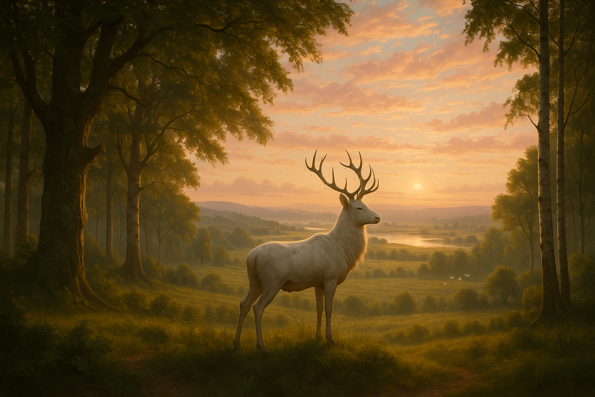 И вдруг в паре десятков метров впереди из-за толстого дуба выступила фигура животного. Элинор ахнула: это был олень. Самый настоящий, хотя и необычайно крупный. Его шкура отливала серебром в лучах солнца. Ростом он был почти с лошадь, грудь могучая, словно высеченная из мрамора. На ветвистых рогах поблескивали капли росы, сверкая, как маленькие звёзды. Несколько секунд олень спокойно смотрел на путников. Дариус замер, стараясь не спугнуть. Элинор сжимала его предплечье, едва дыша. Олень вскинул голову, словно кивнул, затем неторопливо скрылся между деревьями справа, направляясь обратно в глубь леса.