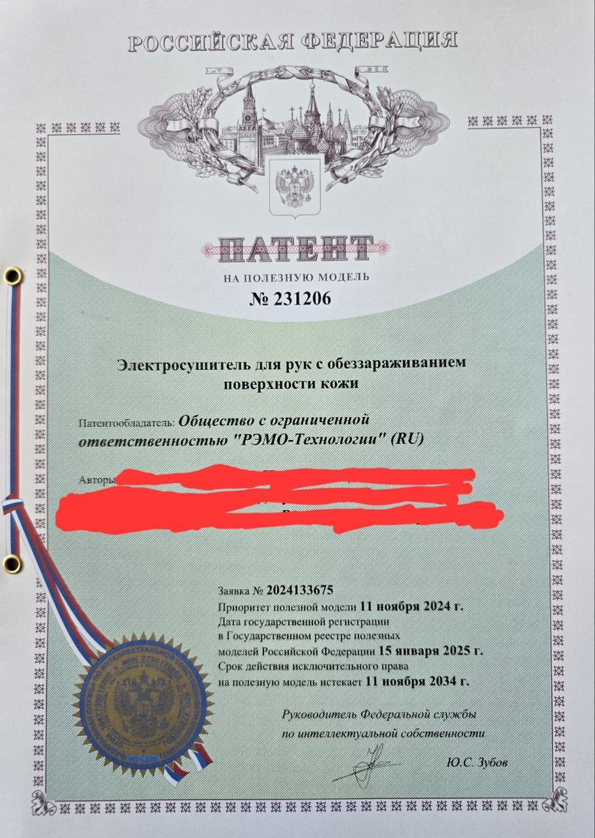Получили ещё один патент. Идея вроде очевидна, но ничего подобного не было. А наша экспертиза в деле ультрафиолетового обеззараживания помогает рождению таких идей🤣 Теперь продать осталось 😃 #рэмо #рэмозавод #рэмоэлектроникс #рукосушка #уф #уфобеззараживание #патент #полезнаямодель