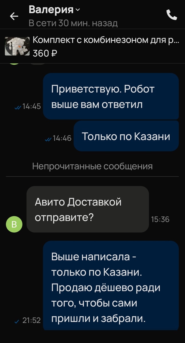 Меня поражает вселенская хитрость некоторых личностей, которые на профессиональном уровне вымарщивают у продавцов на Авито то, что им нужно: Из последнего: Продаю почти не ношенный малышковый комплект дёшево, хотя брала за 1400 р. Опять же обозначила, если доставка, только курьером по Казани - чтобы я не тратила время на походы на почту, в пвз и тп. Человек из Нижнего Новгорода обиделся, решил давить на жалость, что у нее 4 детей, живут впроголодь и тп... Посоветовала ей найти в их городе социальные пункты с одеждой. Теперь с наглыми личностями столкнулась и в качестве турагента. В большей степени по подбору туров в Турцию: Видите, что ко мне в сообщения с запросом зашли 45 человек. Почти половине из них я сделала подбор выгодных путевок. Бесплатно. И ни 1 реальной продажи, потому что в 90% случаев они просто хотели узнать стоимость и прикинуть свои траты на отпуск. При этом в своем скрипте переписки я заранее пишу каждому, что цены быстро меняются. Но неееет 😡 пусть человек потратит