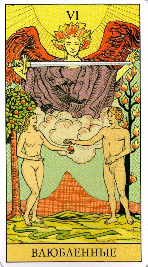На карте изображены Адам и Ева в Эдемском саду. Рядом — змея, дерево познания, а над ними — ангел. Эта сцена говорит не только о романтике, а о выборе, искушении, ответственности и даже духовном взрослении. Это карта не только про чувства, но и про важные решения, которые меняют тебя.