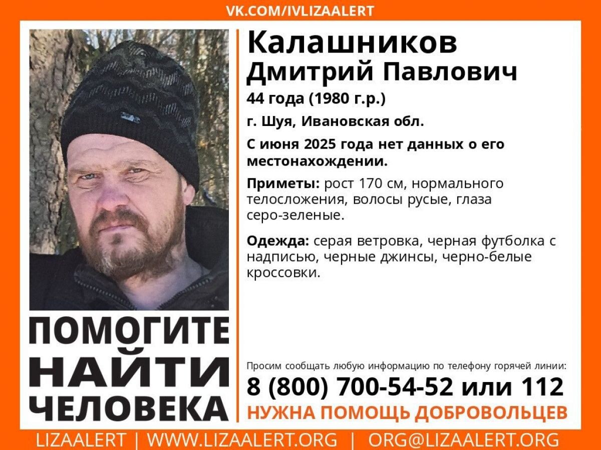 В Шуе Ивановской области перестал выходить на связь 44-летний Дмитрий Калашников. Как информировали сегодня в поисковом отряде «ЛизаАлерт», он пропал в этом месяце и никаких данных о его местоположении на данный момент нет.