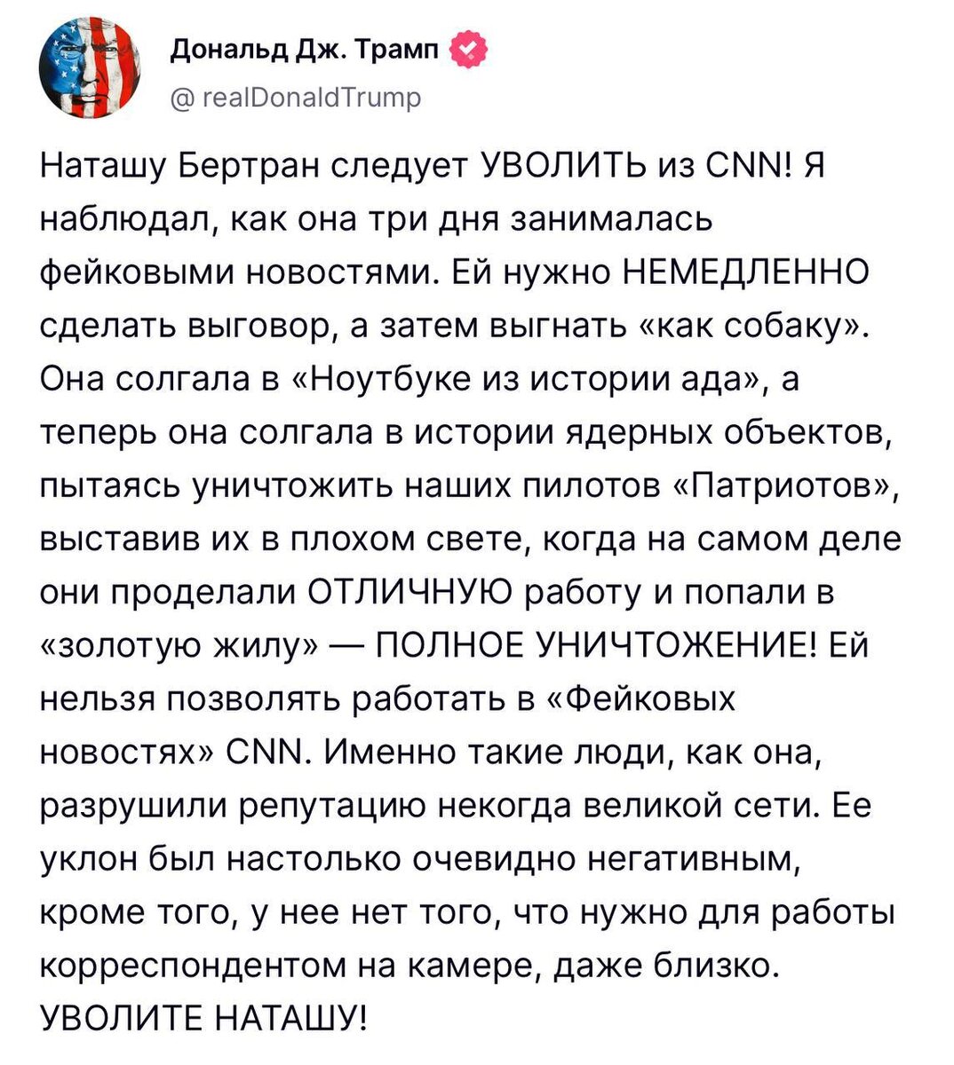 Трамп призвал уволить и выгнать «как собаку» журналистку CNN Наташу Бертран за сообщения о том, что США своими ударами не смогли уничтожить ядерную программу Ирана.