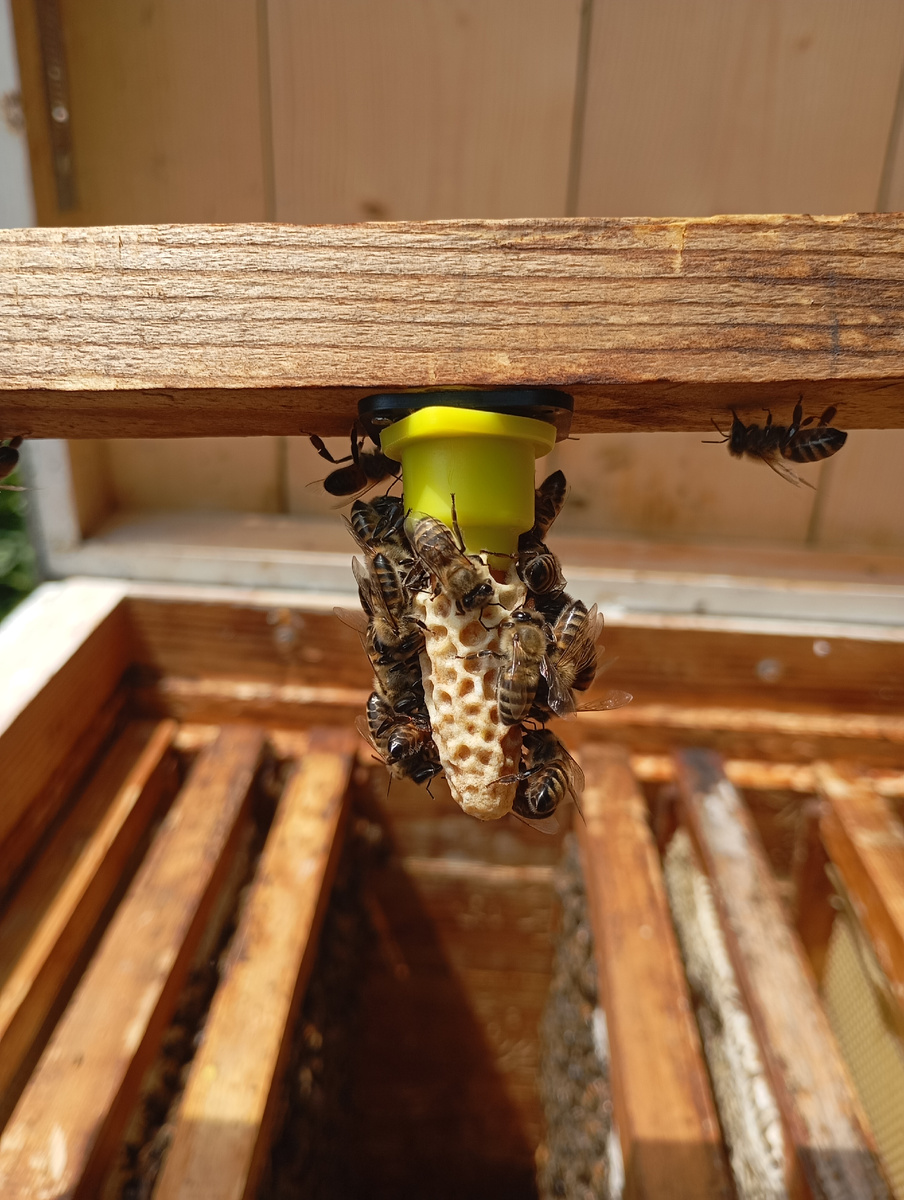 На этот раз я полностью зарядил прививочную рамку мисочками с личинками и разместил её в безматочном отводке. Если честно, был уверен, что история повторится - как в прошлые разы, когда пчёлы напрочь игнорировали подсаженных личинок. Но природа преподнесла сюрприз! При проверке обнаружил крупный, аккуратно запечатанный маточник - зрелище, признаюсь, впечатляющее. Не теряя времени, аккуратно накрыл его защитным колпачком. Теперь с нетерпением жду момента выхода новой королевы улья. Оборудование: ожидание vs реальность