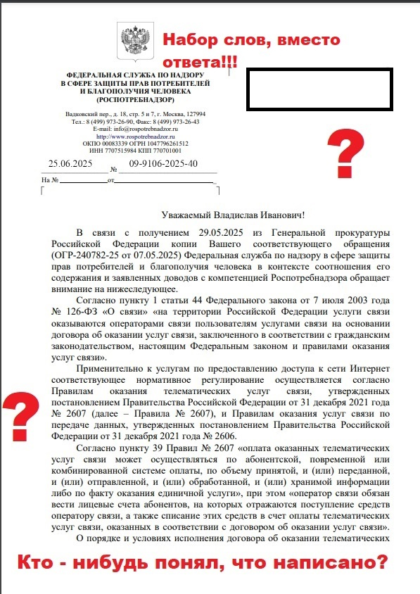 Это не ответ – это бюрократический трэш, который даже прочитать нормально невозможно. Давайте разберём этот шедевр отписки и посмотрим, как Роспотребнадзор "защищает" нас от произвола операторов.