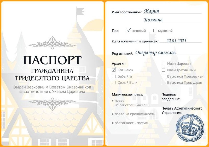 Пока вы отвечаете на опрос и раздумываете о своей проявленности, немного расскажу о том, чем я сама занята. Я уже упоминала о том, что пошла учиться в Мастерскую бизнес Архетипов и совсем скоро, уже через пару неделю начну выдавать людям паспорта Царевичей, Баб Яг, Котов Баюнов и других не менее прекрасных архетипов. Жду с невероятным азартом и волнением. Задача непростая – анализ всех аспектов проявленности человека. Как он говорит, что говорит, как двигается и занимает пространство, ну и о чем рассказывает, конечно. Голова кругом, если честно. Но что, важное я прочувствовала недавно – все всегда пригождается. Я часто это говорю, себе в первую очередь, но вот прочувствовала по-настоящему впервые. В какой-то момент меня накрыло огромной благодарностью к тому, что я практикующий психолог и для меня не трудно остаться с человеком один на один и с искренним интересом задавать ему вопросы про него. Слушать его и слышать. Кому-то сейчас в начале практики будет сильно сложнее, чем мне. За