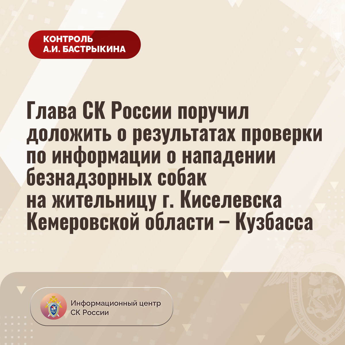 Глава СК России поручил доложить о результатах проверки по информации о нападении безнадзорных собак на жительницу г. Киселевска