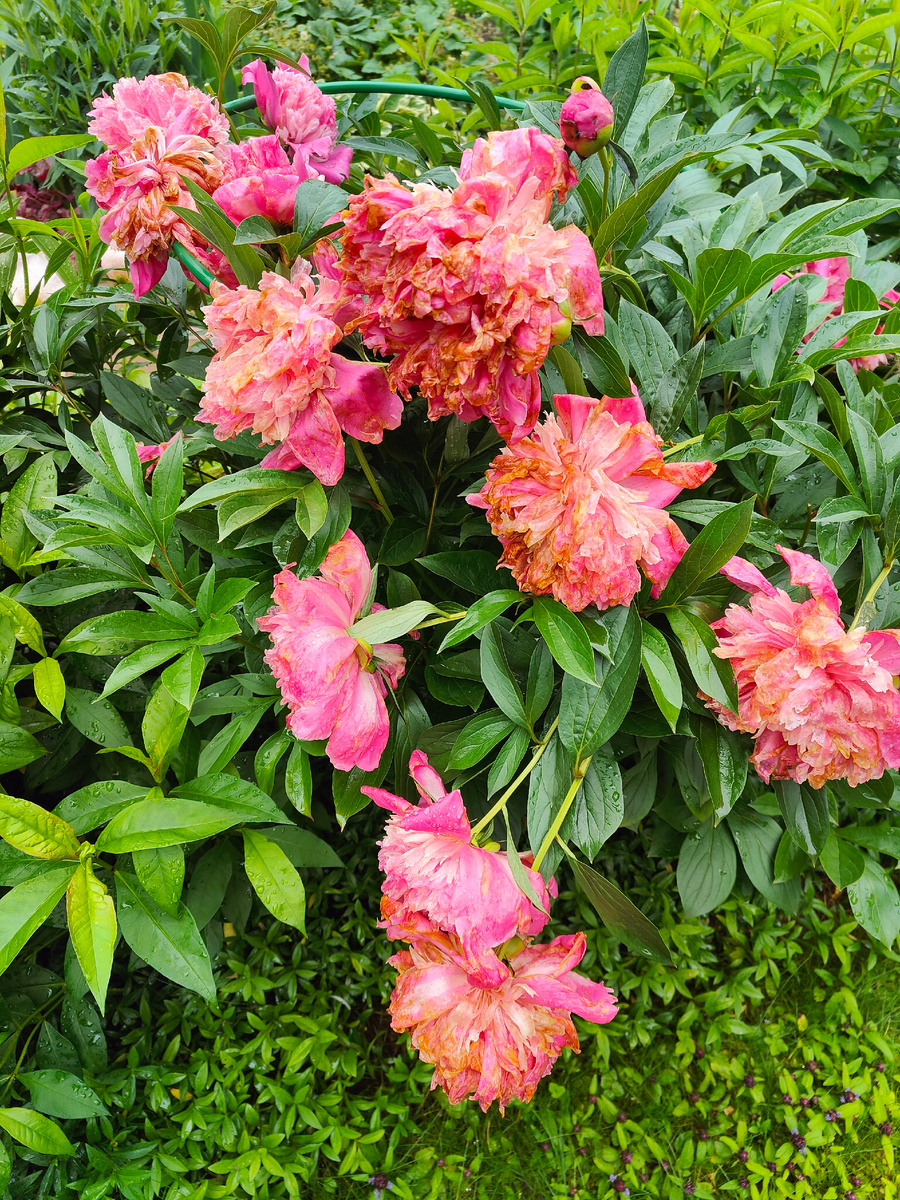 Ранние пионы отцвели. Им очень не повезло с погодой: их цветки, пропитанные дождевой влагой, сгорели на солнце. Вот такое печальное зрелище произошло буквально за день.