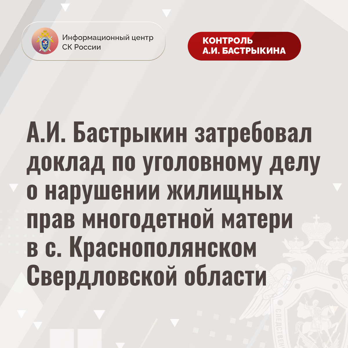 А.И. Бастрыкин затребовал доклад по уголовному делу о нарушении жилищных прав многодетной матери в с. Краснополянском Свердловской области