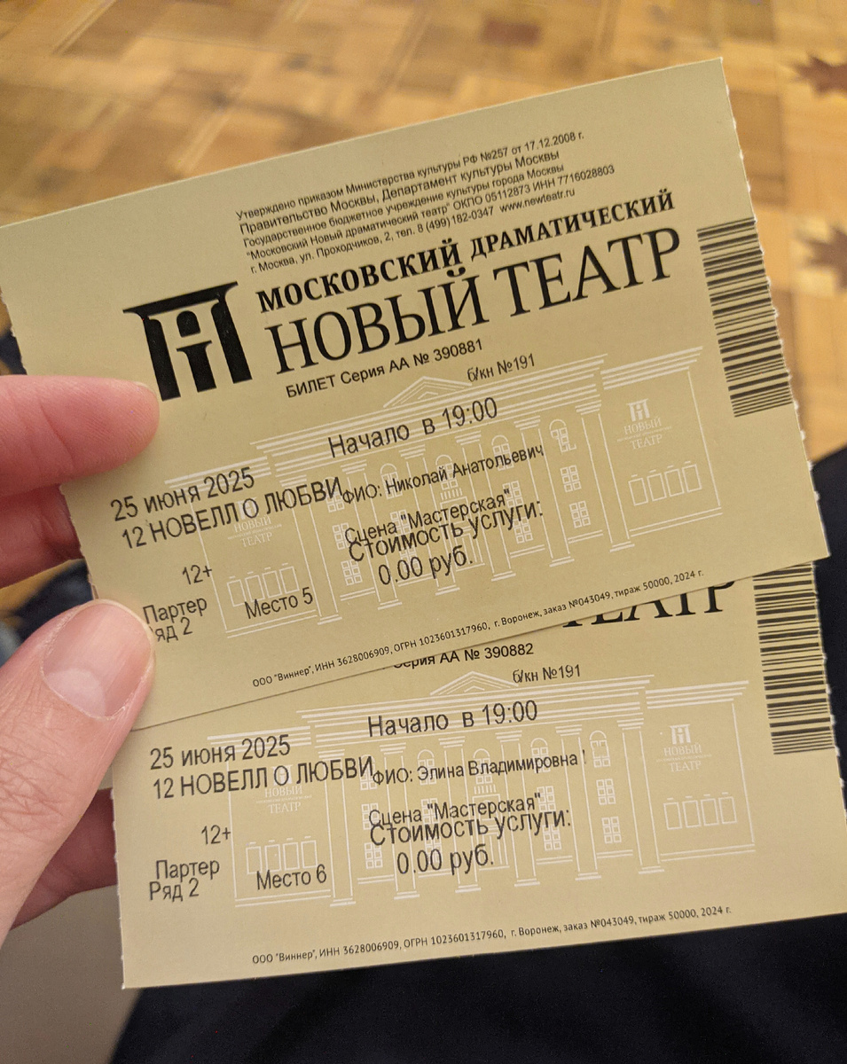 Давненько мы не были у дядюшки в театре и вот случилось: Спектакль по рассказам Чехова. Было и грустно, и смешно. Николаю понравилось - а это бесценно! Потом ещё с дядюшкой поболтали - тоже подарок 🤗. Из покупок был ВкусВилл : Овощи заказывала через приложение. Вместо цукини зачем-то привези огурцы и ещё подарок положили. За подарок спасибо, а за огурцы деньги вернули: Тарелочки Завтрак (9.00): - овсяная каша - абрикос - житный хлеб - масло - бри - колбаска - кофе с молоком Обед (14.30): - тыквенный суп-пюре - салатные листья - зелёный горошек - тыквенный хлеб - масло - мясное ассорти - клубника - лукошко А вот совушка: Сегодня ходила с консьержкой разбираться. Цела 🤪. Вот так выглядит её рабочее место 🤦🏻♀️: Напомню, что это ЦАО г. Москва 🤭. Всем приятного вечера и сладких снов 🤗.