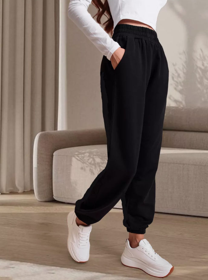 Дизайн в классическом чёрном цвете легко сочетается с различными топами, футболками и худи, позволяя создавать как спортивные, так и кэжуал образы. Брюки оснащены удобными карманами, что делает их практичными для прогулок, тренировок и отдыха.