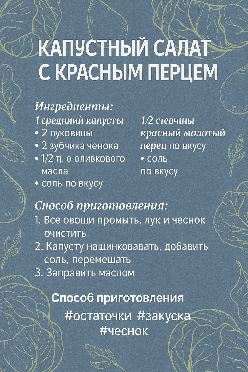 🥗 КАПУСТНЫЙ САЛАТ С КРАСНЫМ ПЕРЦЕМ 🌶️ Когда хочется огонька… но чтобы без драмы в личной жизни! 🔥 Ингредиенты: • 400 г капусты (той самой, что не в кошельке) • 2 луковицы — можно поплакать заранее 🧅 • 2 зубчика чеснока — чтобы к вам не лезли с разговорами • Соль — щепотка на удачу • Красный молотый перец — по вкусу (и по настроению) Как готовить (и не сойти с ума): 1️⃣ Капусту шинкуем, как свои планы на выходные, солим, мешаем — и в угол на 2–3 часа подумать о жизни. 2️⃣ Лук и чеснок мелко рубим, чтобы пахло «по-серьёзке». 3️⃣ Всё это добро перемешиваем, кладём в миску, придавливаем грузом (в идеале — чугунной сковородой или взглядом тёщи). 4️⃣ Выдерживаем 2 суток, и всё — салат, как из деревенского детства, но с перчинкой! Важно: Через 48 часов будет 🔥: салат острый, пикантный, как новая серия любимого сериала! 💬 Подходит к мясу, картошке и к любому разговору на кухне. #рецепты #шуткиплиты #еда #приколыизкухни #овощнойсалат #капустапошла #дзенкухня #юморидлявсех #домашняя
