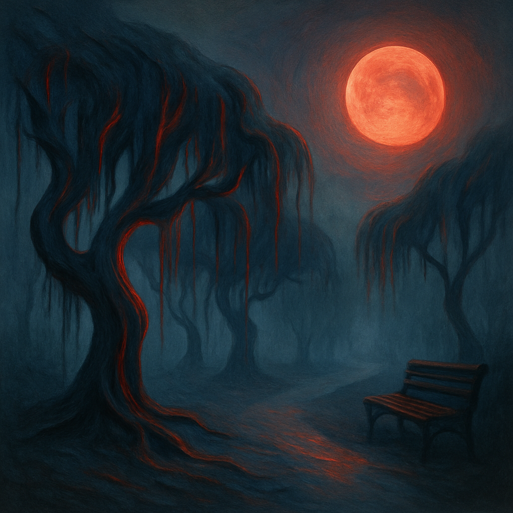 Со всех сторон разило гнилью. Сад казался нелепой копией оригинала, неумело нарисованной картиной безумного художника, безжизненной, лишенной всякого смысла. Деревья изо всех сил пытались казаться настоящими, но краска, нанесённая наспех неведомым творцом на листья, сползала вниз, обнажая мертвенно-болотные оттенки. Под ногами захлюпали топи. Кусты и деревья отчаянно старались сохранить свои очертания, но подёргивались словно в чёрно-белой киноленте минувших эпох. Казалось, ещё немного, и они рухнут в бесформенную массу за ненадобностью для этого странного мира. И лишь копия той привычной Луны, не скрывала истинный облик – кривая, разбитая, она изливала алый свет.