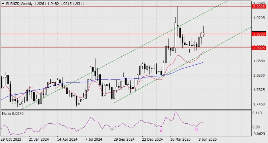 https://basechop.ru/wordpress/?p=48006 EUR/NZD На графике недельного масштаба сигнальная линия осциллятора Марлин развернулась в рост от границы с территорией нисходящей тенденции. В прошлый раз такой паттерн (предшествующая галочка в феврале) стал предвестником семинедельного роста на 1800 пунктов. Мы не ждём полного повторения истории, но потенциал среднесрочного роста имеет сейчас место. Целью роста выступает вершина предшествующего максимума 2.0005. Возможна отработка магнитной точки, образованной пересечением данного уровня с линией ценового канала. На графике дневного масштаба цена закрепилась над целевым уровнем 1.9288. Осциллятор Марлин в положительной области, развивается в собственном повышающемся канале. Слом восходящей тенденции может произойти при уходе цены под линию Крузенштерна в районе отметки 1.9178. На графике Н4 осциллятор Марлин пробивается на положительную территорию, цена при этом закрепилась над уровнем 1.9288. Также цена закреплена над индикаторными линиями…