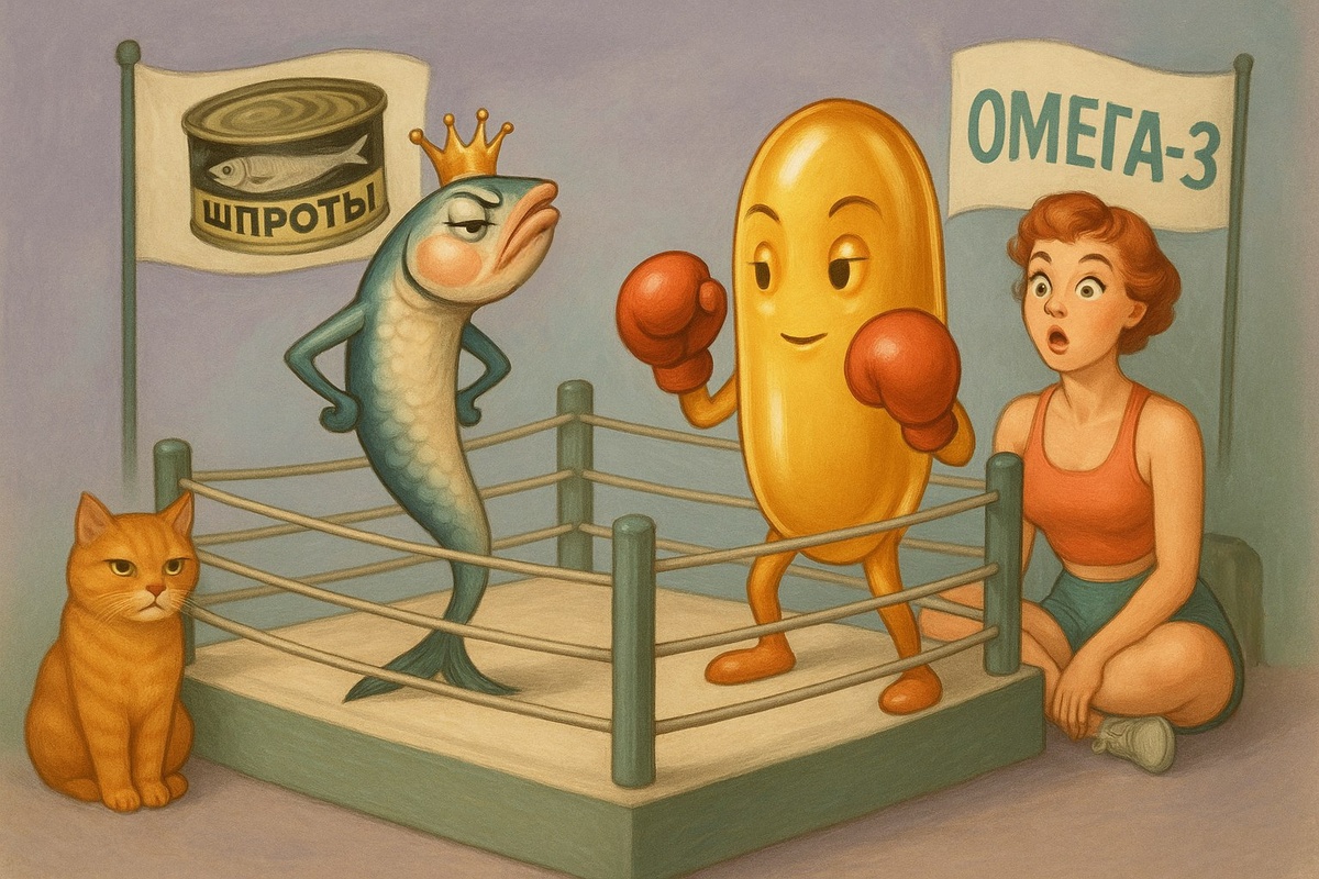И почему одна банка не спасёт мозг, суставы и нервы? Если вы едите шпроты раз в год на Новый год — то это не профилактика, а гастрономическая ностальгия. ЧТО ЗА ЗВЕРЬ ТАКОЙ — ОМЕГА-3? Омега-3 — это жирные кислоты, которых наш организм не производит, но очень хочет. Они как мастера на все руки: – чинят воспаления, – регулируют настроение, – сохраняют память, – смазывают суставы, – питают кожу, – и даже участвуют в стройке гормонов. ОСОБЕННО ВАЖНЫ ДВЕ: EPA (эйкозапентаеновая) — для сосудов, сердца, противовоспалительного действия DHA (докозагексаеновая) — для мозга, глаз, нервной системы. А ШПРОТЫ-ТО ЧТО? – Да, в шпротах есть омега-3. – Но вместе с ними — соль, консерванты, масло неизвестного происхождения. – При копчении часть омеги погибает. – И чтобы получить суточную дозу, нужно съесть банку... с банкой 🙃 Вывод: шпроты — вкусная ностальгия, но не источник здоровья. Это как сказать: «Я гуляла, значит, спортом занималась». КАК ПОНЯТЬ, ЧТО ВАМ НЕ ХВАТАЕТ ОМЕГА-3? Есть список «по