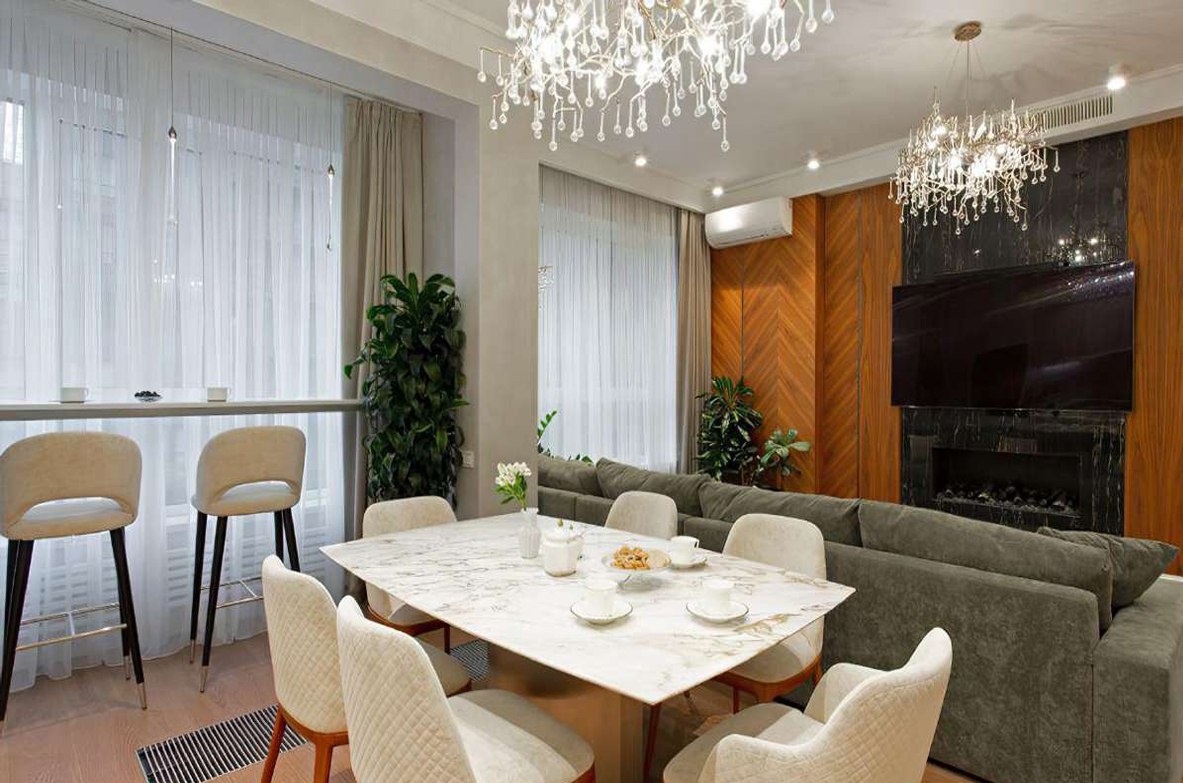 В отделке использованы высококачественные материалы — панели с фактурой дерева, паркет, плитка с текстурой мрамора.